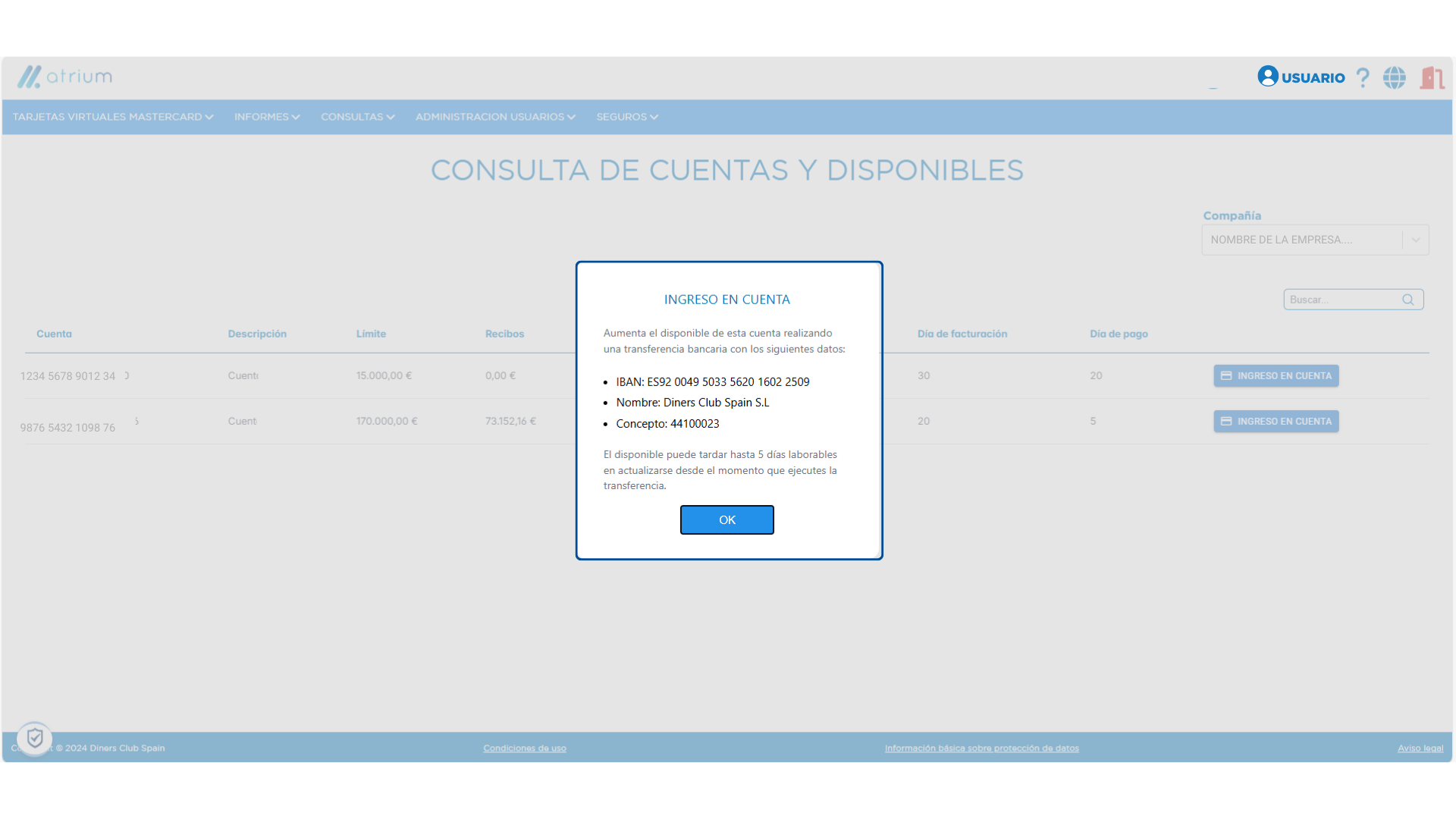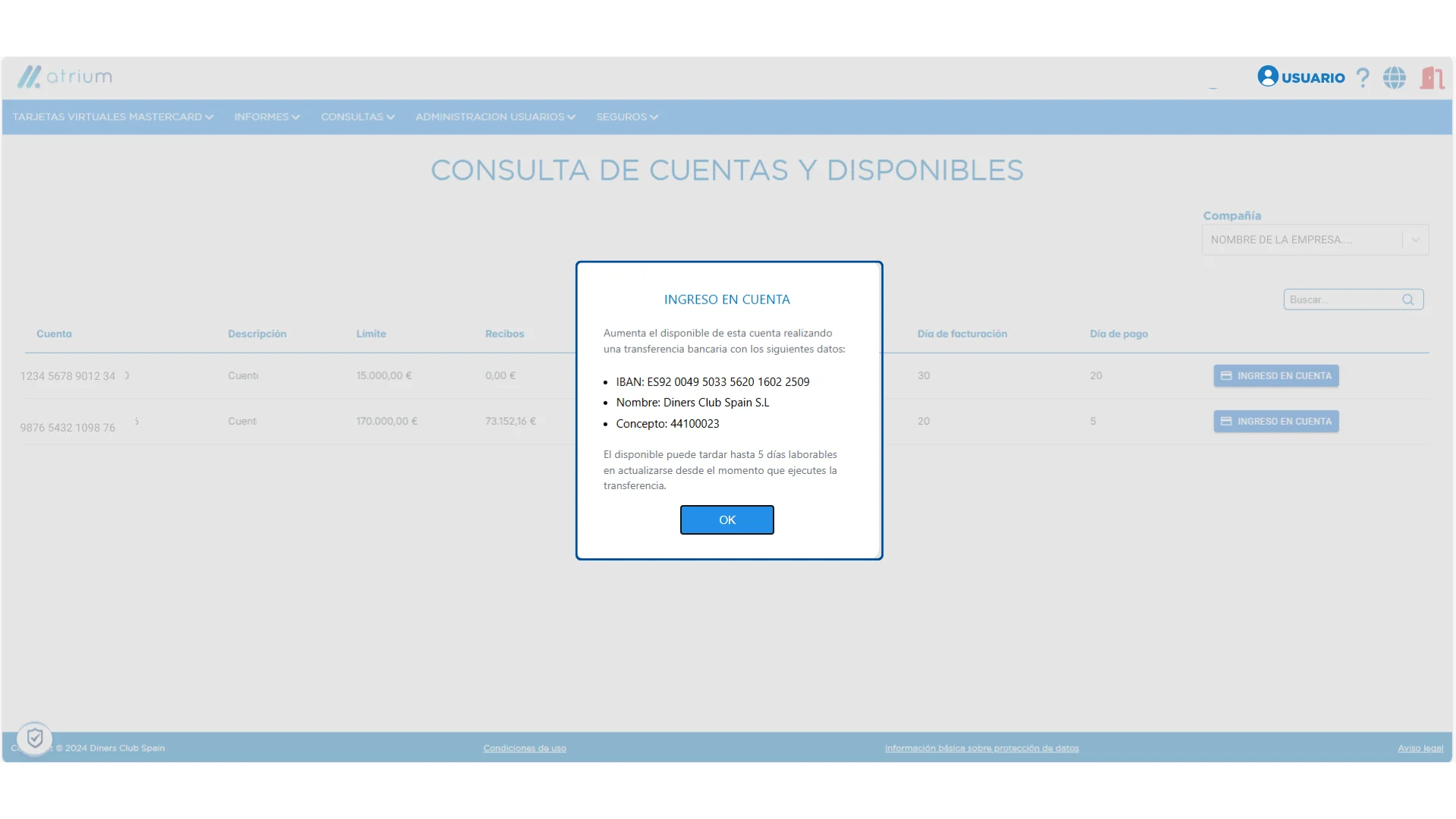 - Nuevo botón “Ingreso en cuenta”: al seleccionar, podrás ver los datos para ingresar dinero en cuenta mediante transferencia.